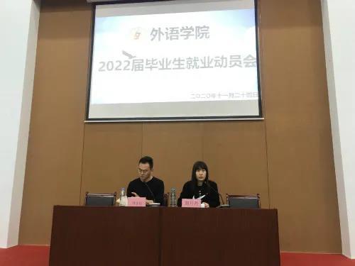 外语学院于11月24日召开“勤学精进‘职’为你来”2022届毕业生就业动员会。动员会由就业指导中心赵丹丹老师主讲,外语学院院长兰巧玲、副院长钱清华以及学院全体专业教师和学生工作者出席会议,学院2022届全体毕业生参加会议,动员会由学院学生工作负责人刘守佳主持。