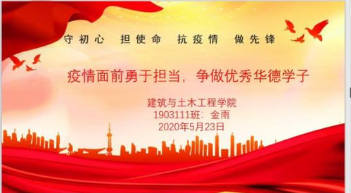 为了讲好华德志愿者抗疫故事,传播华德学子志愿服务正能力,“新时代先锋”宣讲团于5月19日至5月30日在“腾讯会议”开展“疫情面前勇担当,学子胸怀万里程”主题宣讲。宣讲由“新时代先锋”宣讲团优秀志愿者代表1903111班金雨、1803102班徐洋、1703113班王春岩担任主讲人,宣讲活动覆盖了建筑学院三个年级670余名学生。