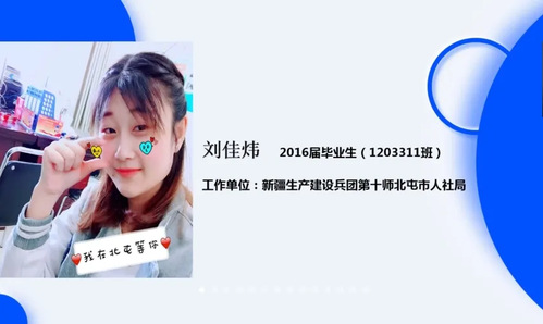 随后,2016届毕业生刘佳炜结合毕业后参加了大学生志愿服务西部计划,并通过努力考入新疆生产建设兵团第十师北屯市人社局事业编制,扎根新疆的成长历程,建议学弟学妹们在未来工作中与母校保持互动和联系,将自身职业规划与祖国需要相结合,将个人价值与国家发展紧密结合,为祖国建设贡献自己的力量。