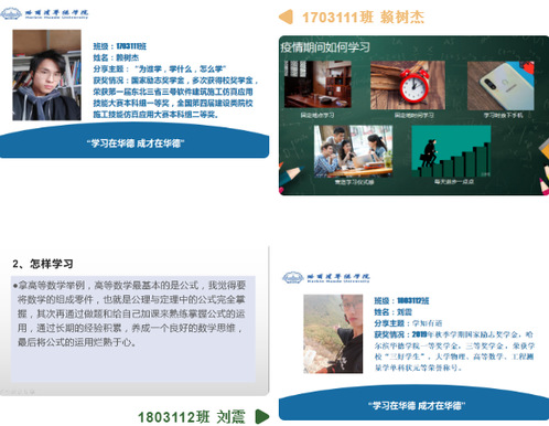 随后,四名同学进行学习经验分享。国家奖学金获得者1603311班刘倩倩同学以“学习在华德 成才在华德”为主题做了分享。她从确立学习目标,合理规划自己的未来;带着问题去学习,及时解决学习中遇到的问题;理论要与实践相结合三个方面讲述了自己的学习方法。1703311班刘孟瑜同学分享了“四学会,融进华德”,针对学会学习、学会生活、学会做人、学会做事分别做了详细讲解,之后针对作为班长在班风、学风建设中应该怎样做发表了自己的看法。1703111班赖树杰同学针对“为谁学、学什么、怎么学”详细介绍了自己的学习方法和经验,对在疫情期间居家怎样学习提出了自己的看法。1803112班刘震同学以“学知有道”为主题分享了自己的学习方法、学习规划,并结合学习科目讲解了目前网络课程的学习技巧。