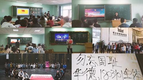 1803101班自入学以来持续开展爱国主义教育,通过参观侵华日军第731部队罪证陈列馆、哈尔滨规划展览馆和开展庆祝新中国成立70周年主题团日活动(荣获哈尔滨华德学院2019年秋季学期“优秀团日活动”称号)、庆祝澳门回归祖国20周年、“不忘初心,牢记使命”等主题团日活动激发同学们的爱国热情,凝聚班级力量,提升班风、学风。