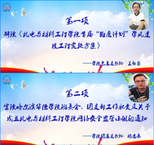 随后,团总支书记杨志承宣读“哈尔滨华德学院班委会、团支部工作职责”及《关于成立机电与材料工程学院网络安全监管小组的通知》。