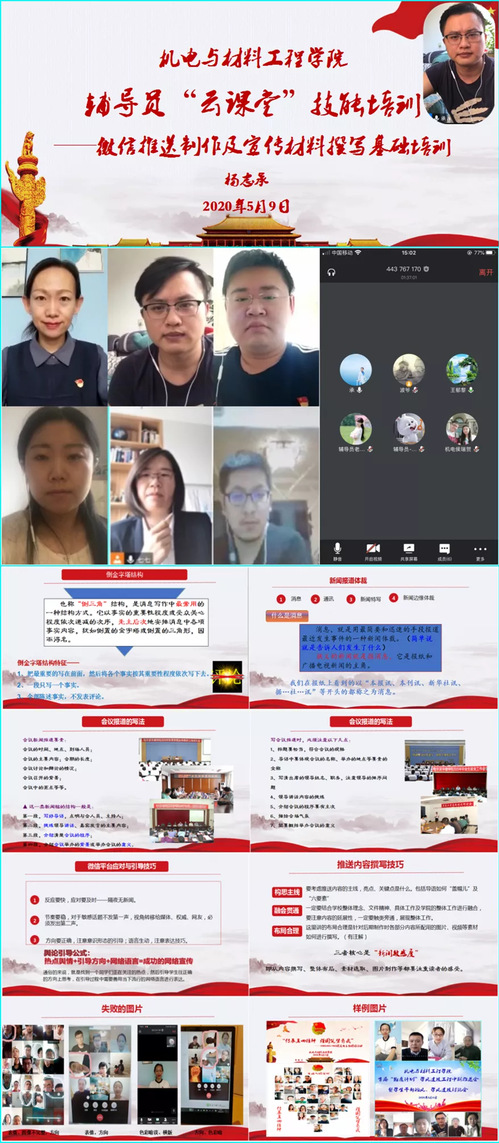 为进一步统一思想,凝聚共识,加强教师间工作交流,提升学工团队整体工作质量,5月9日,机电与材料工程学院开展辅导员“云课堂”技能培训——微信推送制作及宣传材料撰写基础培训。学院党总支书记王郁黎、全体辅导员及行政秘书参加培训,培训会由学院团总支书记杨志承主讲。