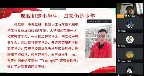 为深入贯彻落实学校和机器人工程学院班风、学风建设实施方案要求,充分发挥学生党员干部的模范带头作用,4月28日下午,我院学生党支部通过“腾讯会议”平台召开强学风 聚能量 促发展——以党风促学风发挥党员先锋模范作用讨论会。机器人工程学院党总支书记刘显忠、党总支副书记刘张、组织委员杨凯名、宣传委员王泽鹏及支部全体党员参加会议,会议由学生党支部书记刘存艳主持。