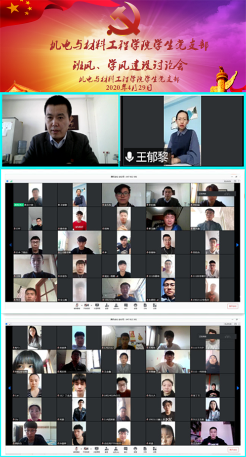 4月29日,机电与材料工程学院学生党支部通过“腾讯会议”平台召开班风、学风建设讨论会。校长助理兼机电与材料工程学院院长、党总支副书记李长威,学院党总支书记王郁黎,党总支宣传委员杨志承,全体学生党员及入党积极分子代表出席会议,会议由学生党支部书记侯瑞贺主持。