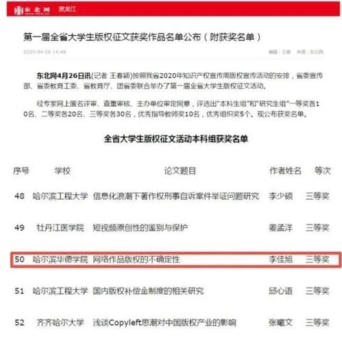 近日,第一届黑龙江省大学生版权征文活动圆满落幕。我校推荐选送由艺术学院马旭远老师指导、1904311班李佳旭同学撰写的《网络作品版权的不确定性》征文作品获本科生组“三等奖”,全省同类高校中仅有2名学生获此组别奖项。