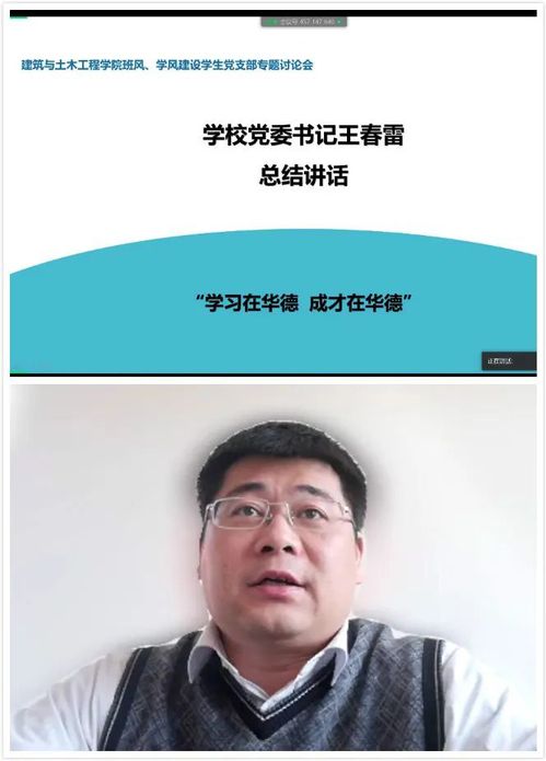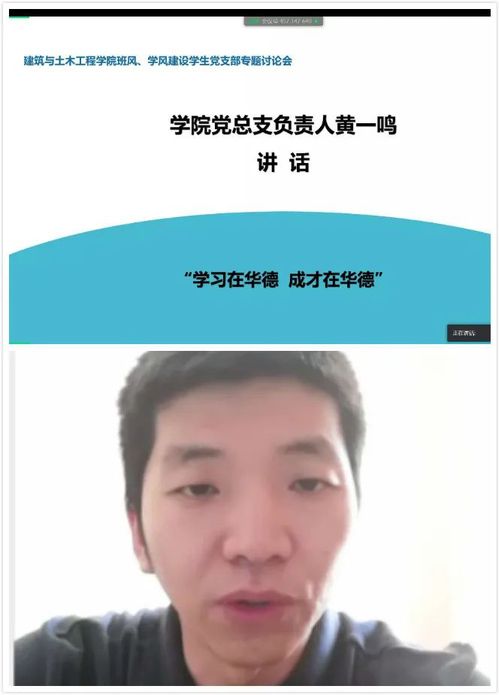 为营造“学习在华德,成才在华德”的良好氛围,建筑与土木工程学院学生党支部于4月27日在“腾讯会议”平台召开党员大会暨班风、学风建设专题讨论会。学校党委书记王春雷、学院党总支负责人黄一鸣出席会议,学生党支部组织委员张健、宣传委员洪音以及全体学生党员参加会议,会议由学生支部书记郝云松主持。