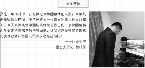 清明节当日,我校学生工作系统组织师生参加全国性哀悼活动,在这样特别的日子里,为抗击新冠肺炎疫情斗争牺牲烈士和逝世同胞默哀。