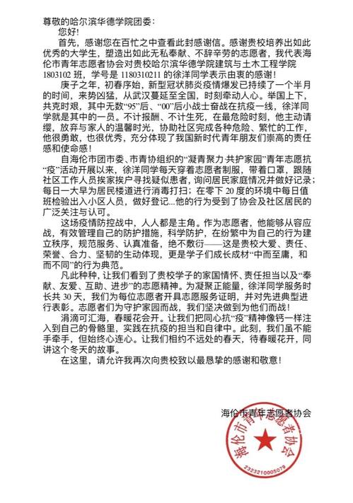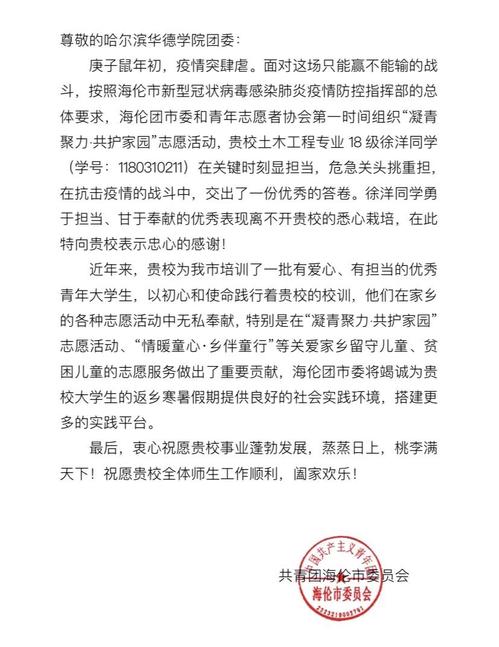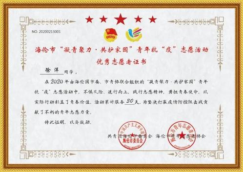 一直以来,徐洋同学都十分热心公益,多次获得黑龙江省教育厅颁发的“优秀志愿者”荣誉证书。2018年寒暑假期间他开始参加共青团海伦市委员会发起的“情暖童心 相伴童行”志愿者服务项目。2019年被选举成为海伦市青年志愿者协会常任理事会成员,并成为“情暖童心 相伴童行”项目负责人,现任海伦市青年志愿者协会副会长。疫情期间,他用实际行动守护着居住的城市,践行着“大爱、责任、荣誉、合力、坚韧”的华德精神,为打赢疫情阻击战贡献青春力量,书写着无愧于时代的青春华章!