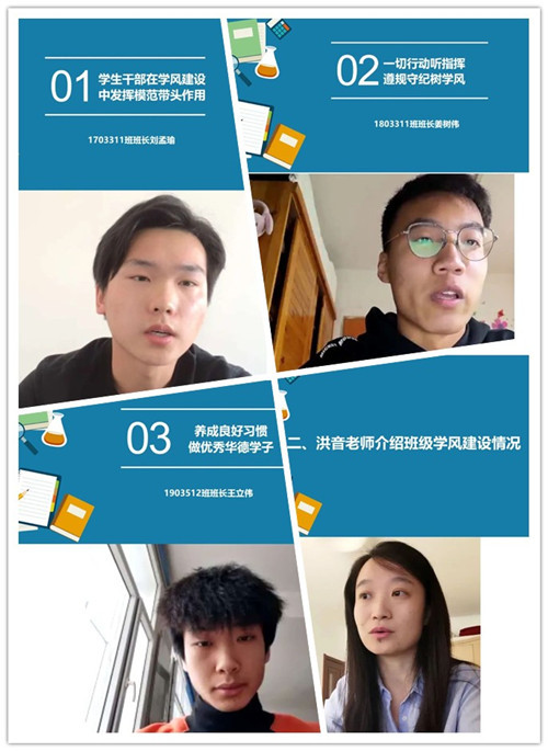 2017级辅导员洪音作为辅导员代表,针对班级学风建设情况进行发言。她指出,通过四周的网络学习,大部分学生求知欲较强,能够快速适应网课学习。针对个别学习动力不足的学生,通过家校共建,师生联动等机制督促学生学习,取得了明显的效果。