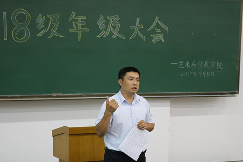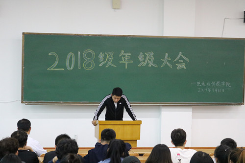 2019年9月10日,艺术与传媒学院在教二202室召开2018级年级大会。艺术与传媒学院院长助理孙洪鹏、2018级辅导员黄涛出席会议,2018级全体学生参加会议。