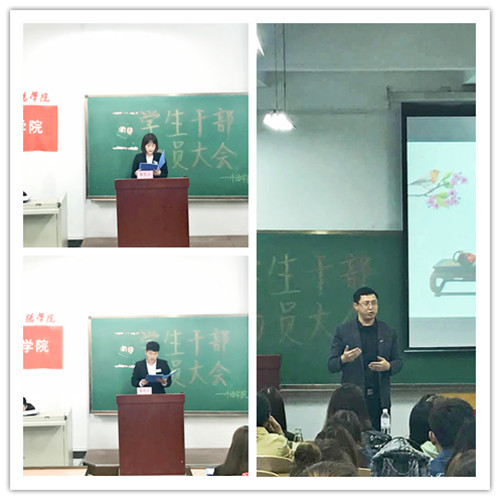 会上,魏明磊老师分别宣读了《哈尔滨华德学院学生工作系统进一步强抓学风建设工作方案》、《关于231名校(院)级学生组织学生干部(干事)的免职决定》、《哈尔滨华德学院学生干部自律守则》;随后,学生会主席宋洋、1606212班班长魏帅、优秀寝室长代表2719寝朱红、学生党员张雨薇分别发言,就个人本职工作表明了积极的工作态度,并表示将在学习、工作与生活中率先垂范,做学生们的榜样。