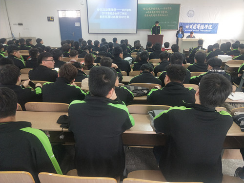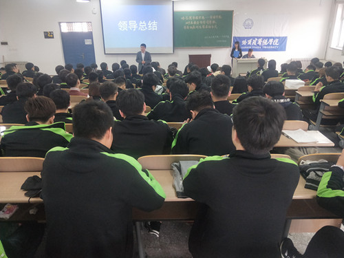 (李滨/文)4月18日,“华德—吉利”学院在第五教学楼301教室举行2019届校企合作订单班素质拓展训练营启动仪式。校长助理兼机电与汽车工程学院院长李长威、机器人工程学院常务副院长刘显忠、机电与汽车工程学院党总支书记付洪涛、机器人学院副院长刘张、机电学院团总支书记杨志承、2019届毕业班辅导员出席,吉利学院2019届订单班全体学生参加。