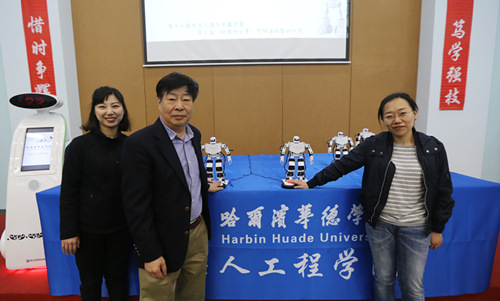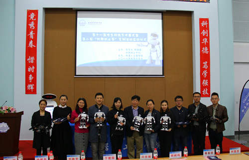 邓校长、顾助理、于建国教授共同按下哈尔滨华德学院第十一届学生科技节开幕式暨第二届“创新创业季”系列活动启动仪式按钮,本届科技节及“创新创业季”活动就此拉开帷幕。