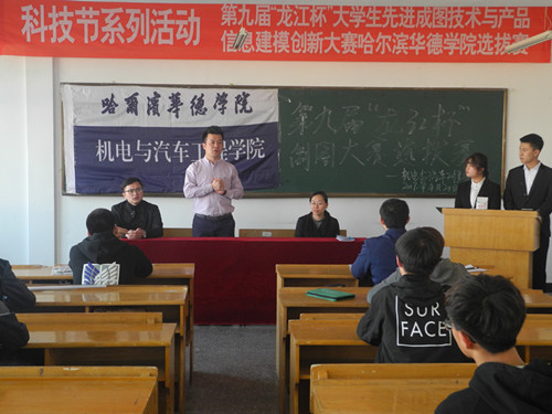 (李滨/文)4月19日、20日,机电与汽车工程学院在第四教学楼401、402、403、404、405、406等教室,举办了科技节系列活动——第九届黑龙江省“龙江杯”大学生先进成图技术与产品信息建模创新大赛哈尔滨华德学院选拔赛。学院副院长付洪涛、国际合作交流中心主任顾鹂鸣、学院团总支负责人杨志承、部分辅导员出席比赛。