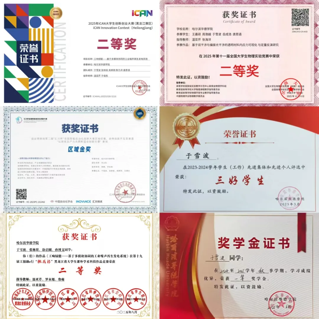 在各类学科与创新竞赛的备赛过程中,于雪波始终将创新思维贯穿全程,不囿于传统思路,敢于突破、勇于尝试。面对竞赛中的技术难题与设计挑战,他总能结合车辆工程专业特点,跳出固有框架,带领队友从全新角度分析问题、构思方案,将专业所学与创新想法融合,让技术落地、让创意成型。从“建行杯”中国国际大学生创新大赛的科创攻坚,到全国大学生物理实验竞赛的原理探究,再到“挑战杯”“汇川杯”等赛事的实战比拼,他凭借扎实的专业功底、灵活的创新思维和默契的团队协作,在省级、国家级赛场一路披荆斩棘。先后斩获 “建行杯”中国国际大学生创新大赛省赛金奖、全国大学生物理实验竞赛国赛二等奖、全国三维数字化创新设计大赛省赛二等奖、“挑战杯”省赛二等奖、“汇川杯”区域赛金奖、“大唐杯”省赛三等奖等多项荣誉 。一张张证书的背后,是兴趣驱动的持续探索,是创新思维的不断锤炼,更是以赛铸技的扎实沉淀,也让他在竞技比拼中不断拓宽专业视野,练就了过硬的工程实践能力与创新攻坚能力。