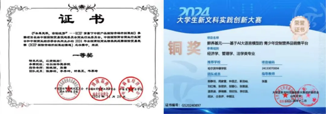 在2025年中国国际大学生创新大赛中,她作为项目负责人,运用生产运营、市场营销与统计学等专业知识,带领团队在高教主赛道与产业赛道中双线作战,一举斩获 2项省级银奖及校级金奖 。在纳入学科竞赛排行榜的2024年全国高校商业精英挑战赛RCEP国际市场开拓策划赛道中,她带领团队深入研究区域经贸规则,策划国际市场拓展方案,从众多参赛队伍中脱颖而出,摘得 全国总决赛一等奖 。